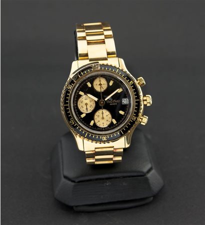 Cassa e bracciale in oro giallo; lunetta graduata girevole, tasti a pompa; quadrante con indici applicati; contatore funzione 24 ore al 12, secondi continui al 9, ore al 6