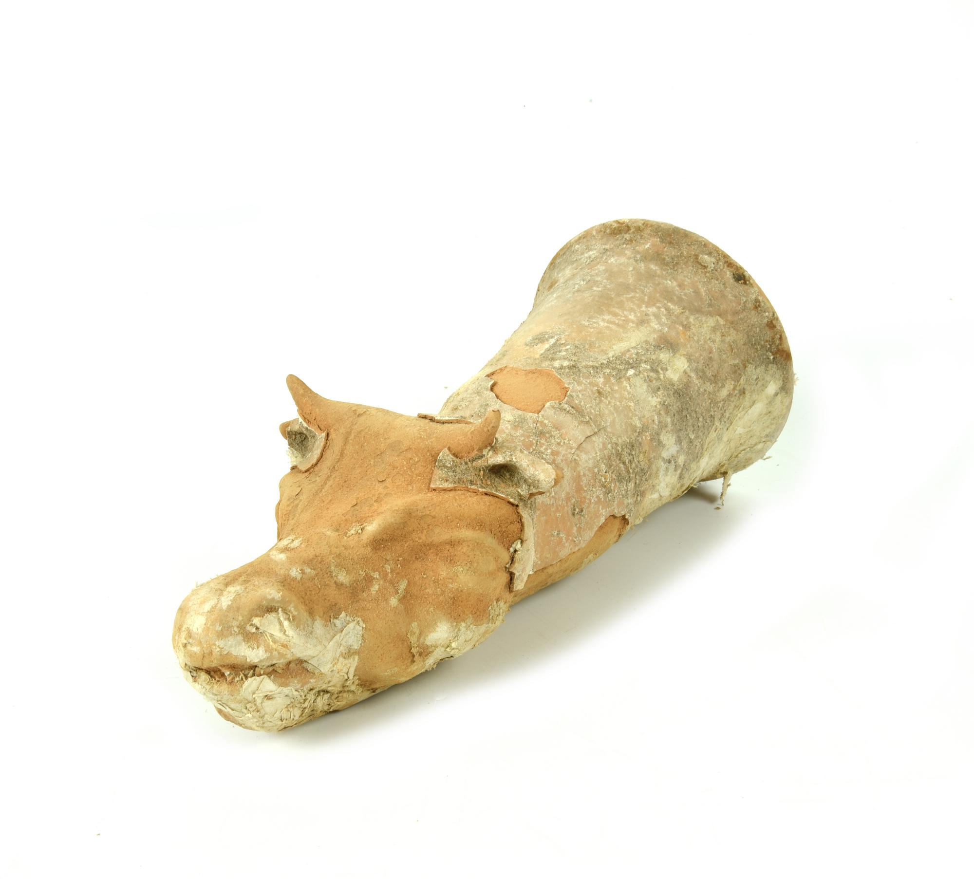 Rython con corpo cilindrico desinente in una testa di toro, realisticamente modellata con corna aguzze e orecchie erette
