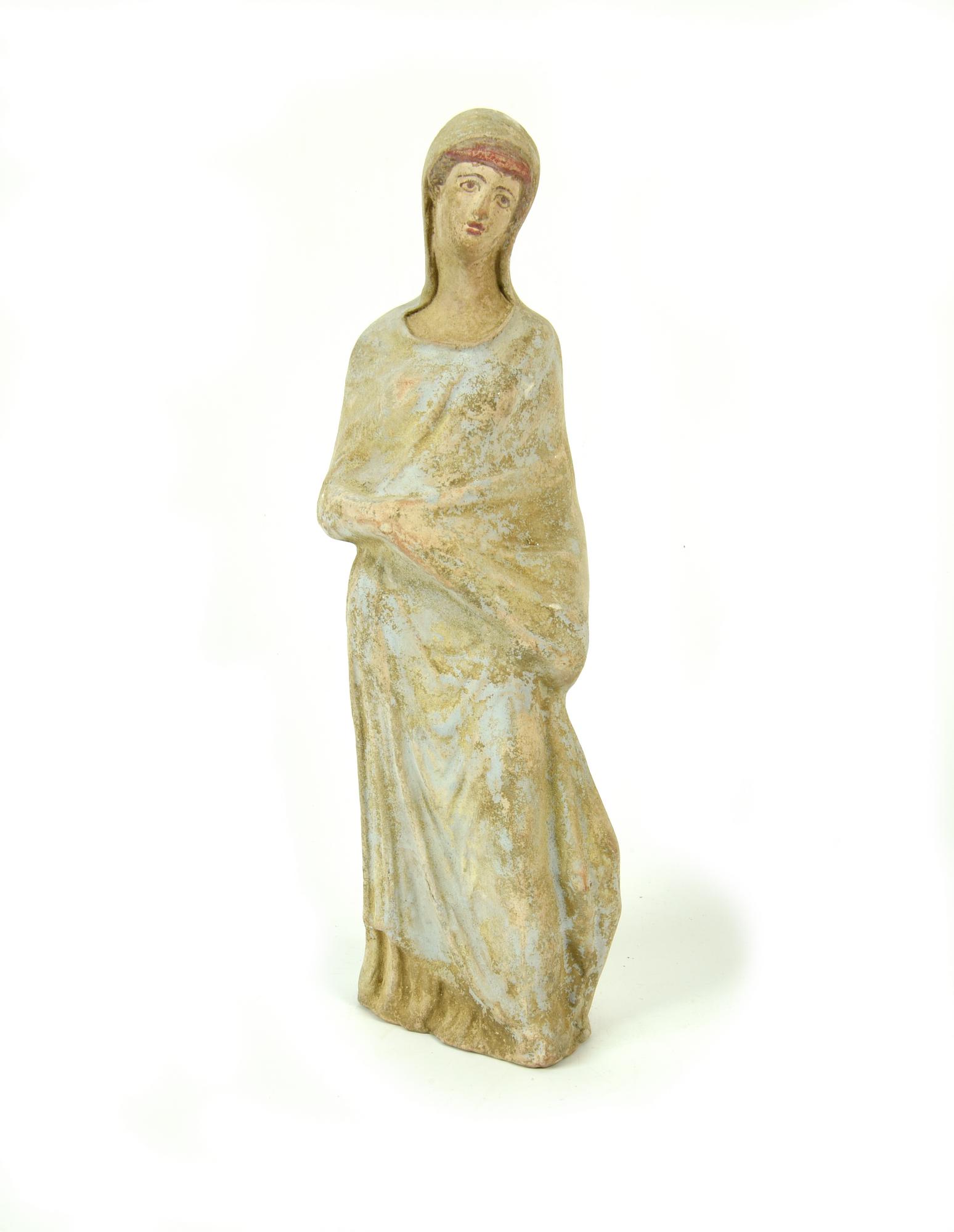 Statuetta di giovane donna velata, con lo sguardo rivolto in avanti, stante sulla gamba destra arretrata, la sinistra flessa e portata in avanti; i capelli ondulati sono elegantemente raccolti in uno chignon sulla nuca, il volto pur nelle sue piccole dimensioni e' modellato con grande verismo; la giovane e' completamente avvolta nel mantello col braccio destro flesso sul ventre, mentre l'altro e' portato sul fianco