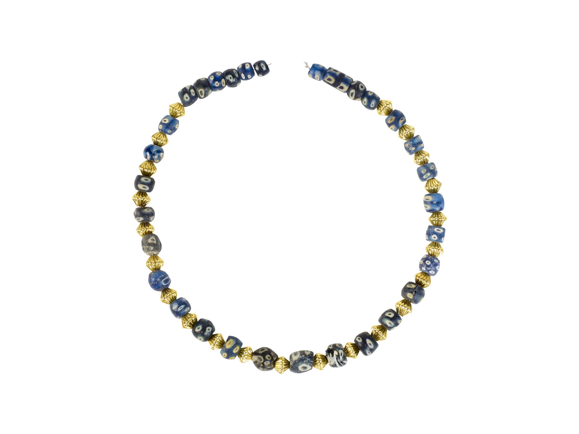 Collana con vaghi di forma approssimativamente cilindrica in pasta vitrea blu a murrine alternati ad elementi moderni di forma biconica striata in metallo dorato