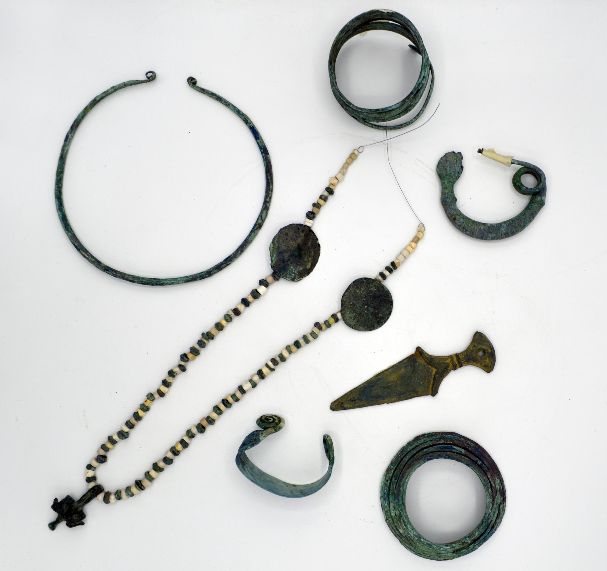 Corredo composto da una collana con vaghi in calcare bianco e bronzo, un pendente a serpente stilizzato e due elementi a scudo circolare in bronzo; un torque in verga di bronzo; una grande fibula ad arco semplice, una piccola armilla in lamina con estremita' a ricciolo, due grandi armille spiraliformi in verga di bronzo ed un modellino di daga a lama triangolare. (7)
