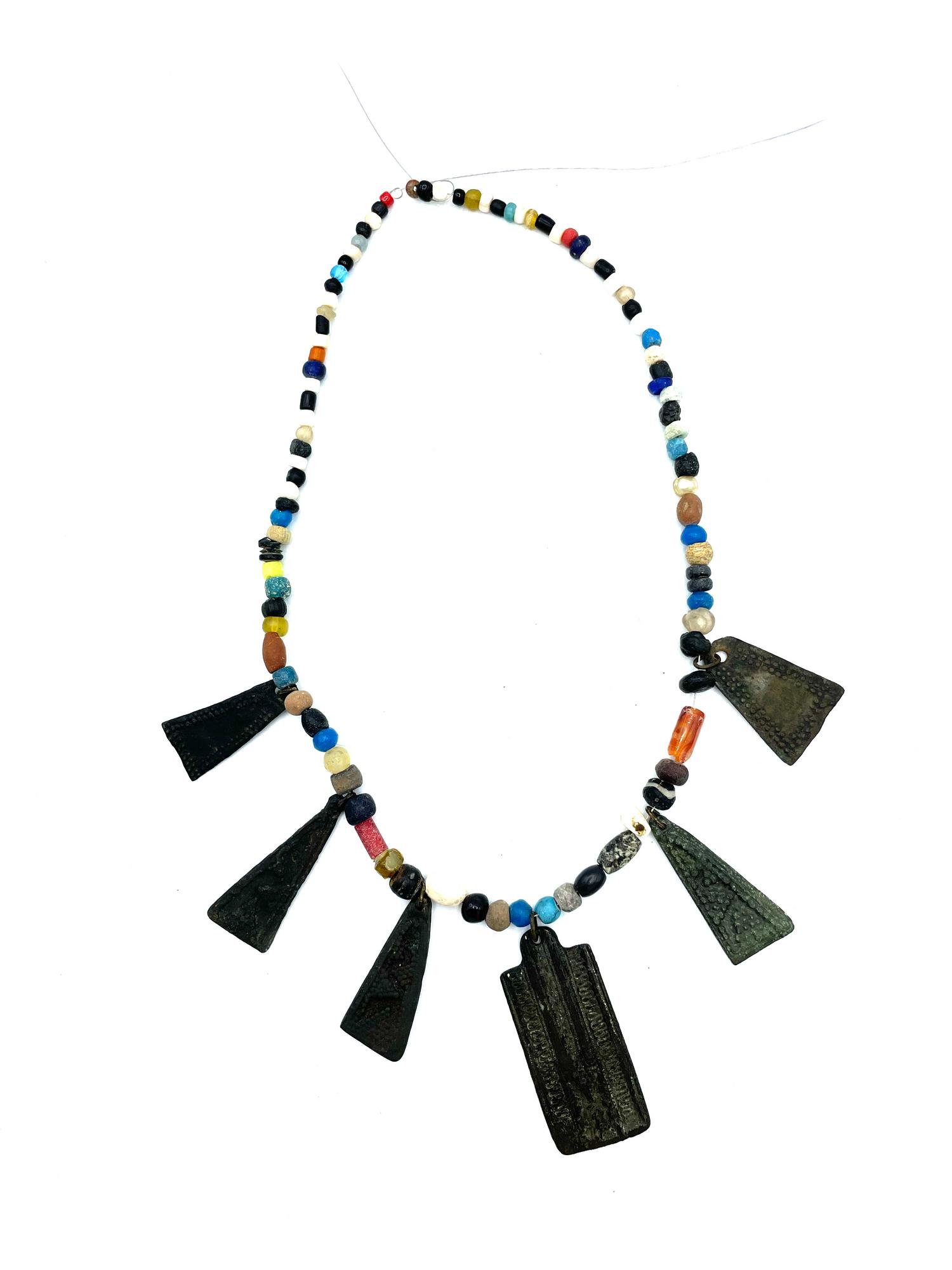 Collana ad un filo con vaghi in pasta vitrea colorata con sette pendenti trapezoidali in bronzo fuso, cesellato, decorati a sferette in rilievo