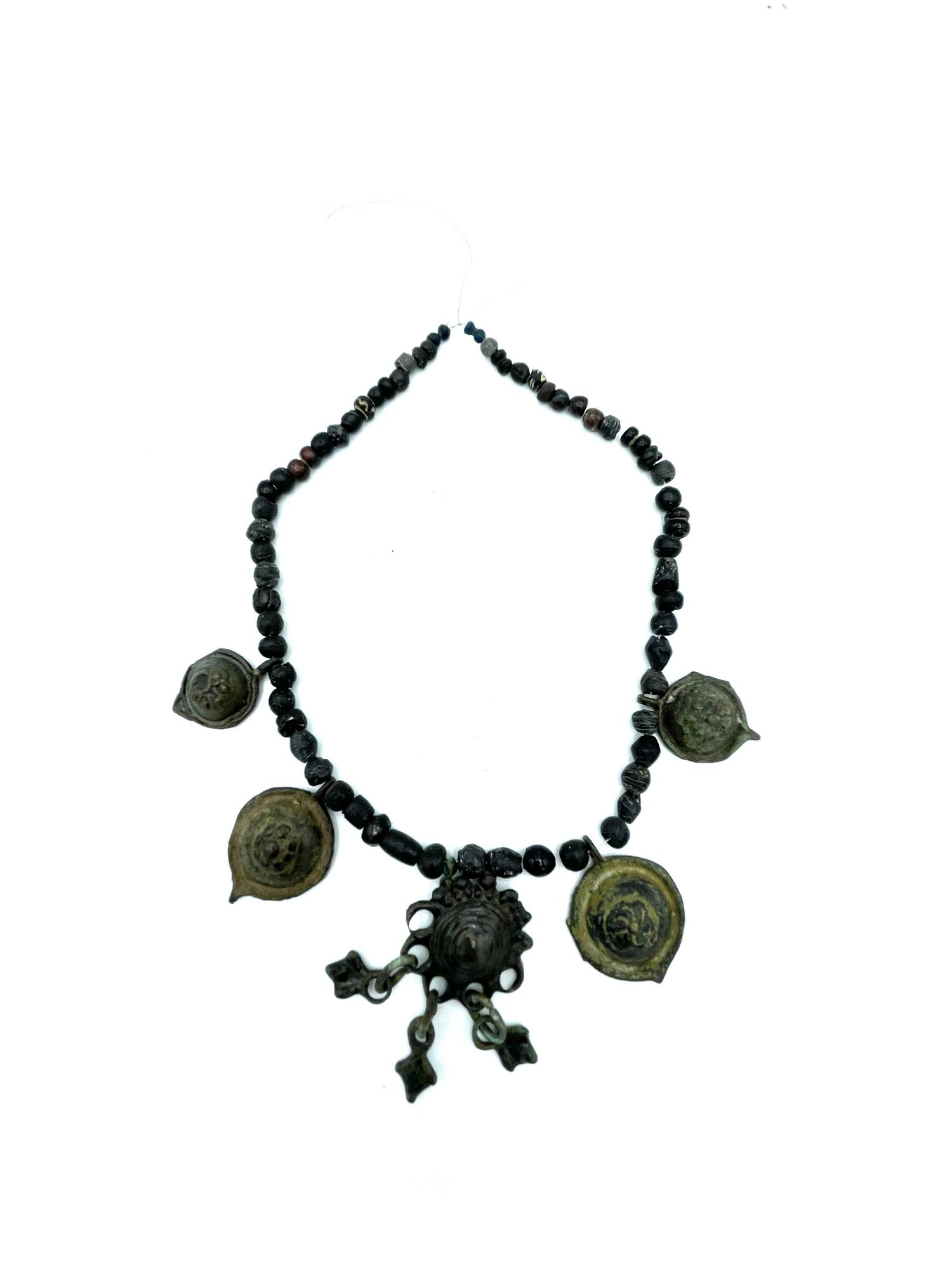 Collana ad un filo con vaghi in pasta vitrea nera con cinque grandi pendenti umbonati, di cui quello centrale con catenelle, in bronzo fuso, cesellato e traforato