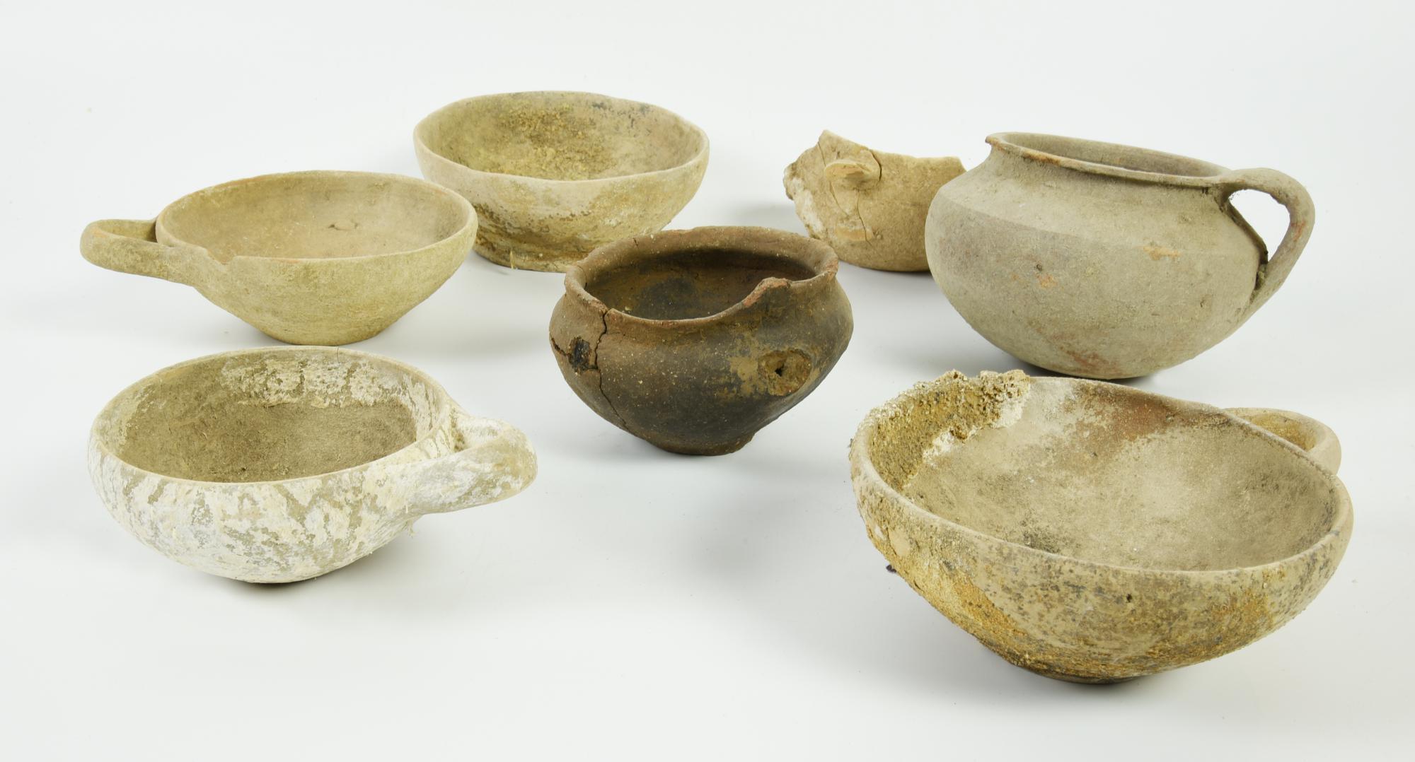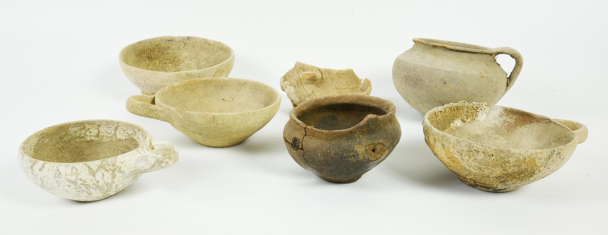 Quattro coppette monoansate con labbro leggermente rientrante, vasca poco profonda, fondo piatto; due ollette monoansate di cui una con corpo lenticolare e l'altra troncoconico, una coppetta in impasto bruno con orlo svasato