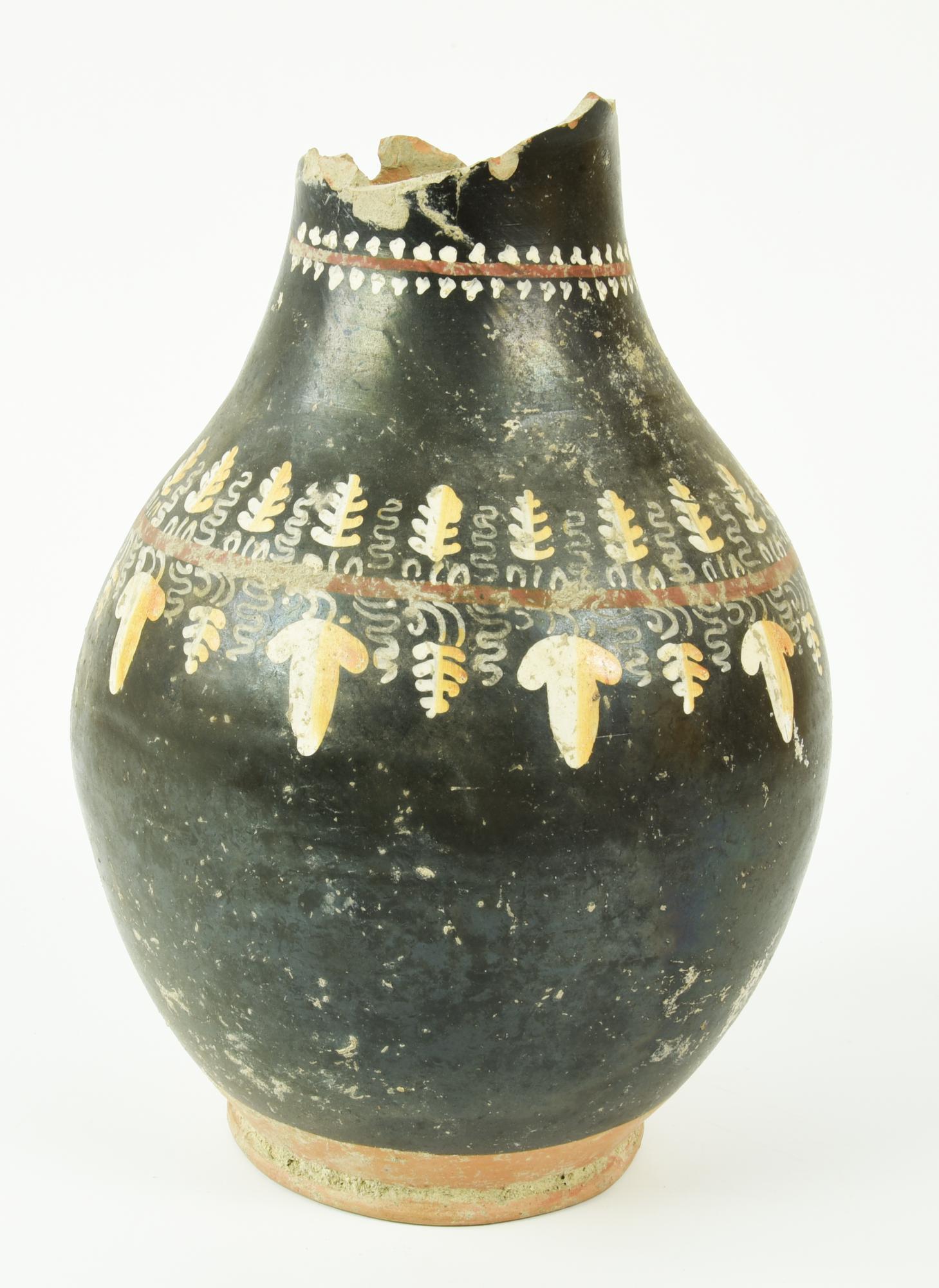 DECORAZIONE: interamente verniciata ad eccezione della parte inferiore risparmiata; sul collo fascia con foglie e corimbi d'edera, sul ventre un ampio tralcio di vite con pampini, viticci e grappoli