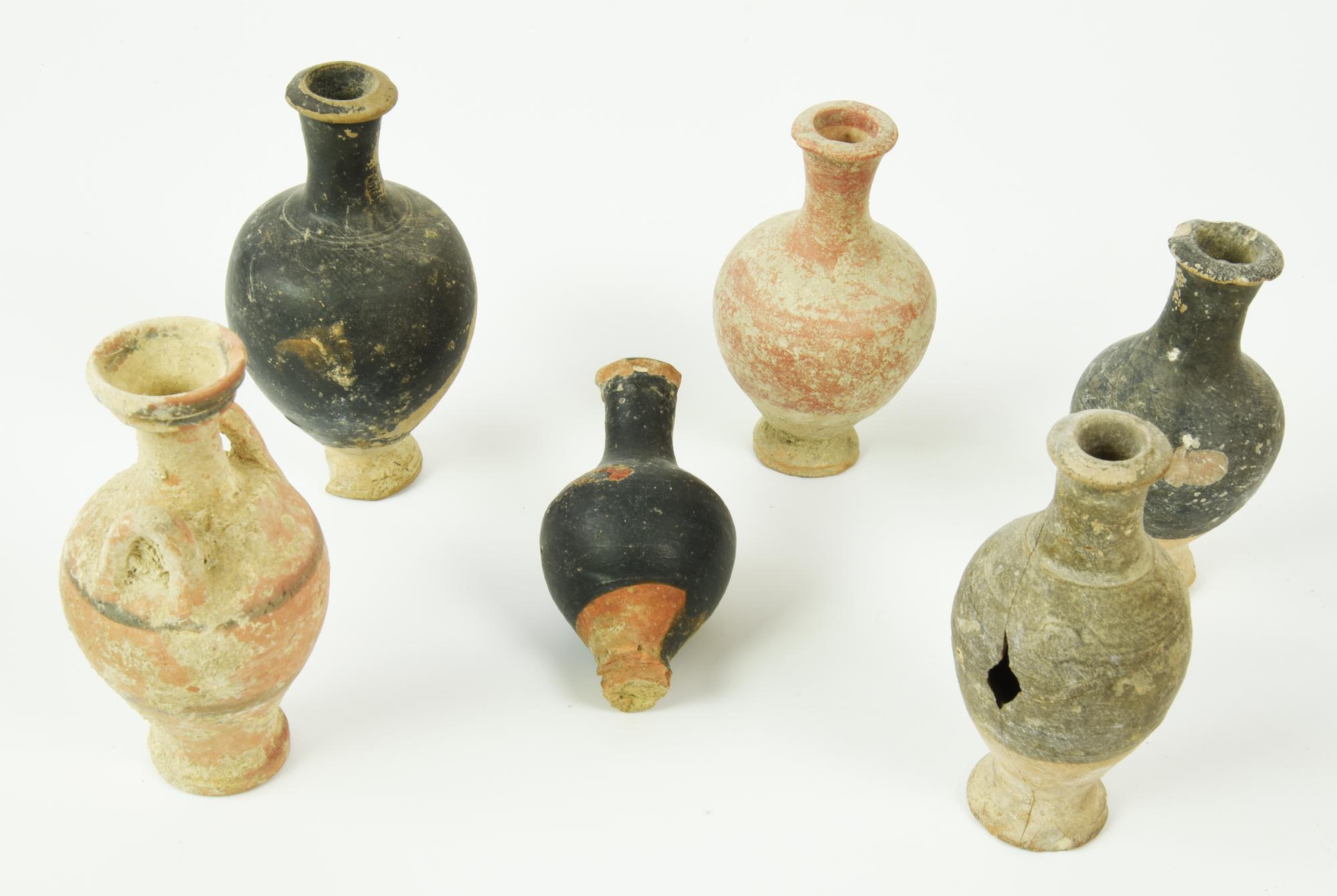 Cinque unguentari fusiformi con bocchello a tesa, alto collo cilindrico, corpo ovoide, piede troconconico, un unguentario con bocchello ad echino rovescio, alto collo cilindrico, corpo ovoide, piede modanato, anse a nastro impostate orizzontalmente sulla spalla