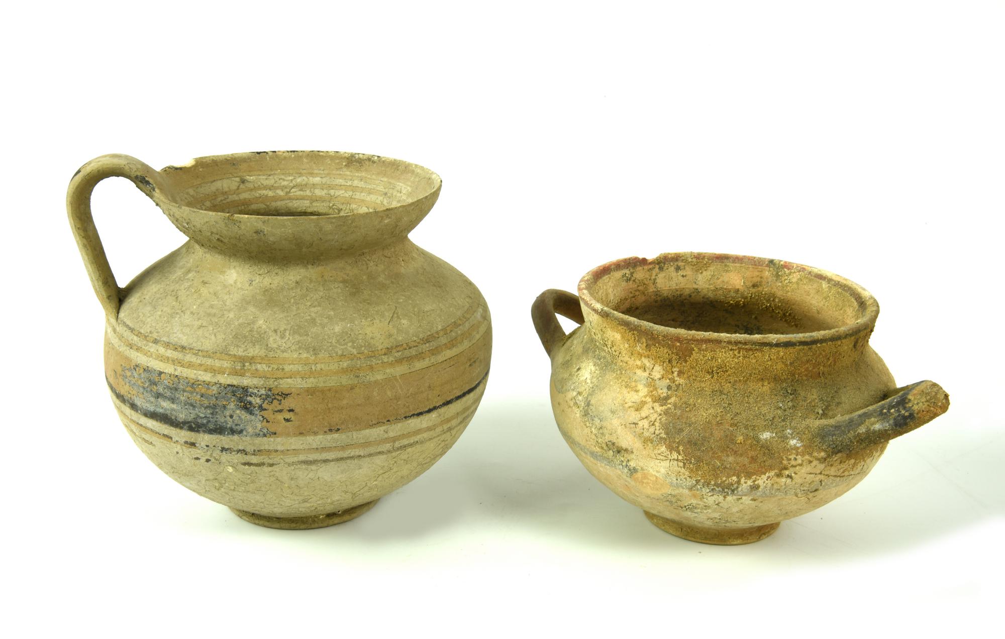Olletta con orlo estroflesso e labbro arrotondato, collo a profilo concavo, corpo globulare, fondo piatto; anse a nastro, impostate obliquamente sulla spalla, decorata sul collo e sulle anse a vernice nera; brocchetta con orlo svasato, corpo ovoide, piede a disco, ansa a nastro impostata dall'orlo alla spalla, decorata a fasce e filetti in bruno e paonazzo