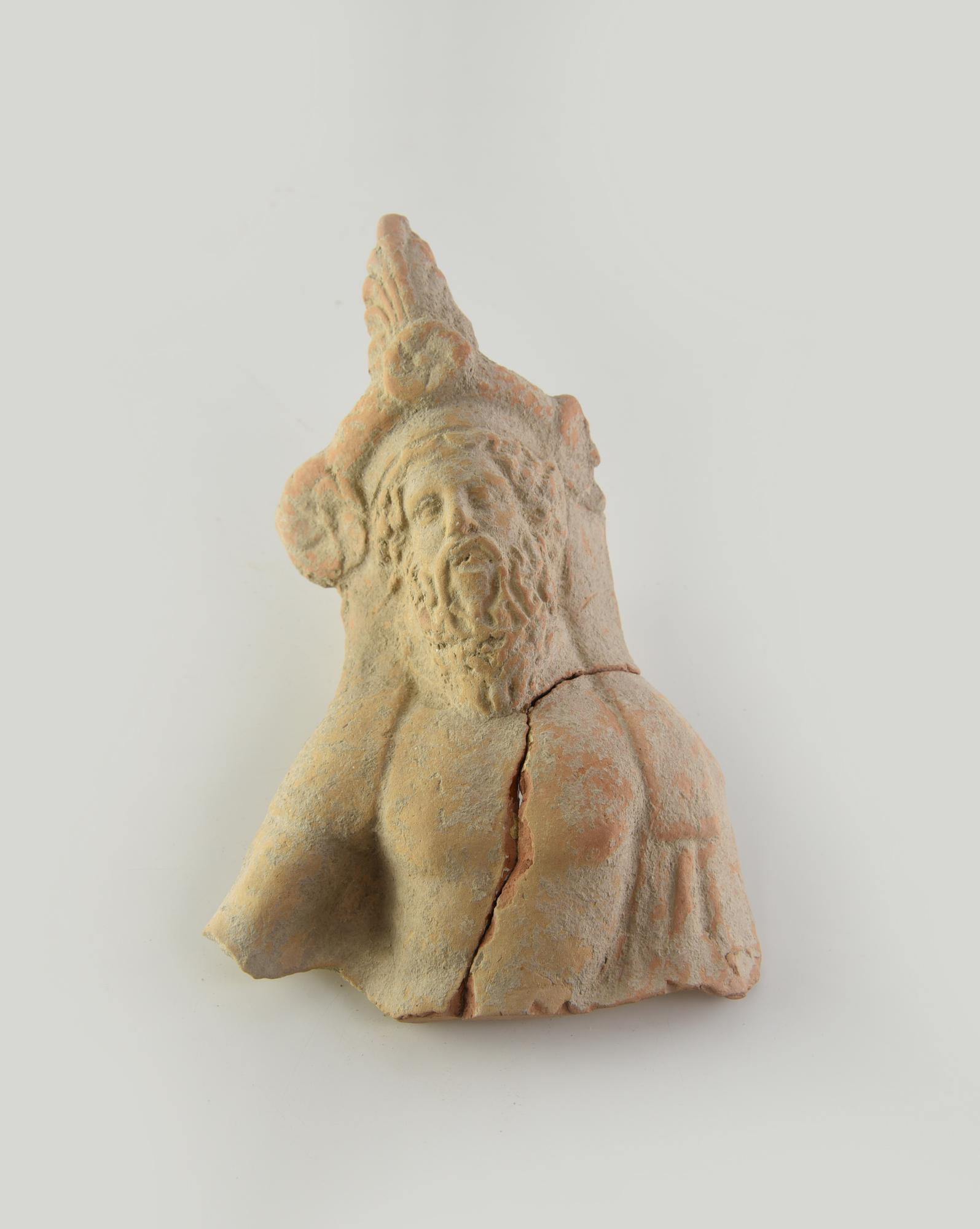 Busto maschile di uomo maturo, pertinente ad una statuetta di banchettante, l'uomo e' raffigurato recumbente a destra, col torace scoperto, indossa una corona sormontata da una palmetta e desinente in due fiori di ibisco ai lati, ha lunghi capelli e folta barba che gli ricade sul petto; il volto pur nelle piccole dimensioni e' realizzato con grande accuratezza