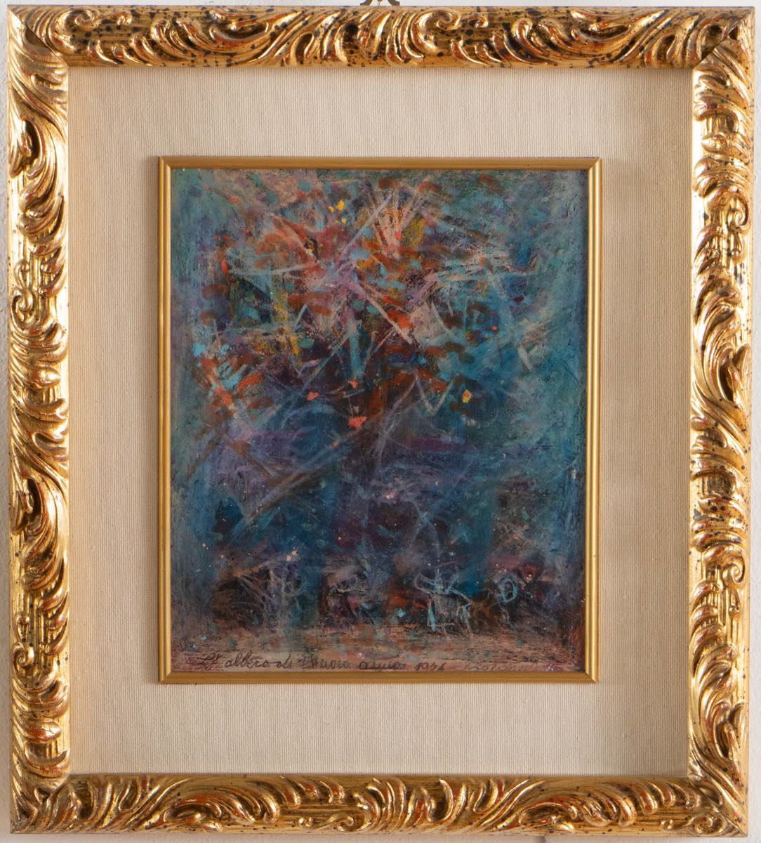 Olio su tavola, reca in basso iscrizione con titolo, data e firma dell’artista “L’albero di fuoco – anno 1971 – Borgonzoni”, H cm 26x21.5 – con cornice H cm 40.5x37