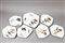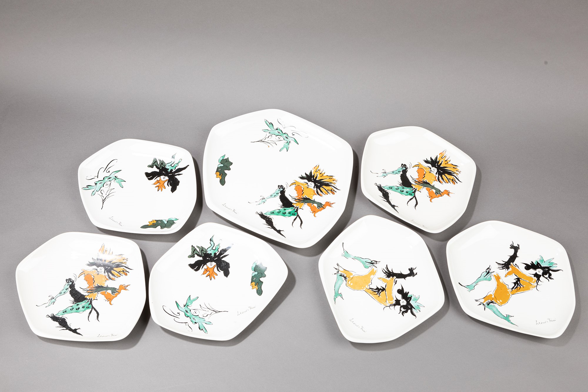 Leonor Fini - Servizio da dolceh 2 x 24 x 22 cm; grande piatto: h 3 x 29 x 32 cm In porcellana composto da sei piattini e un piatto. Decoro Figure con maschere, decalcomanie tratte dai disegni di Leonor Fini. Produzione Società Ceramica italiana Laveno. Marchio sotto la base. Etichetta originale.