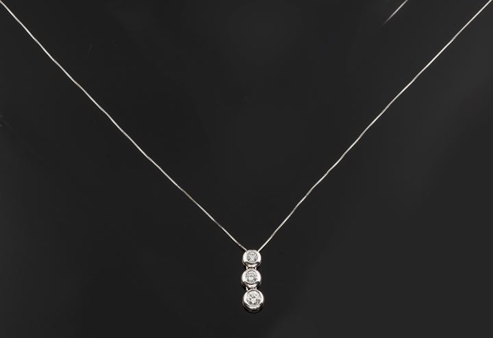 Collana con ciondolo in oro bianco con tre diamanti taglio brillante per complessivi ct 1,15 ca disposti in fila entro castoni tondi