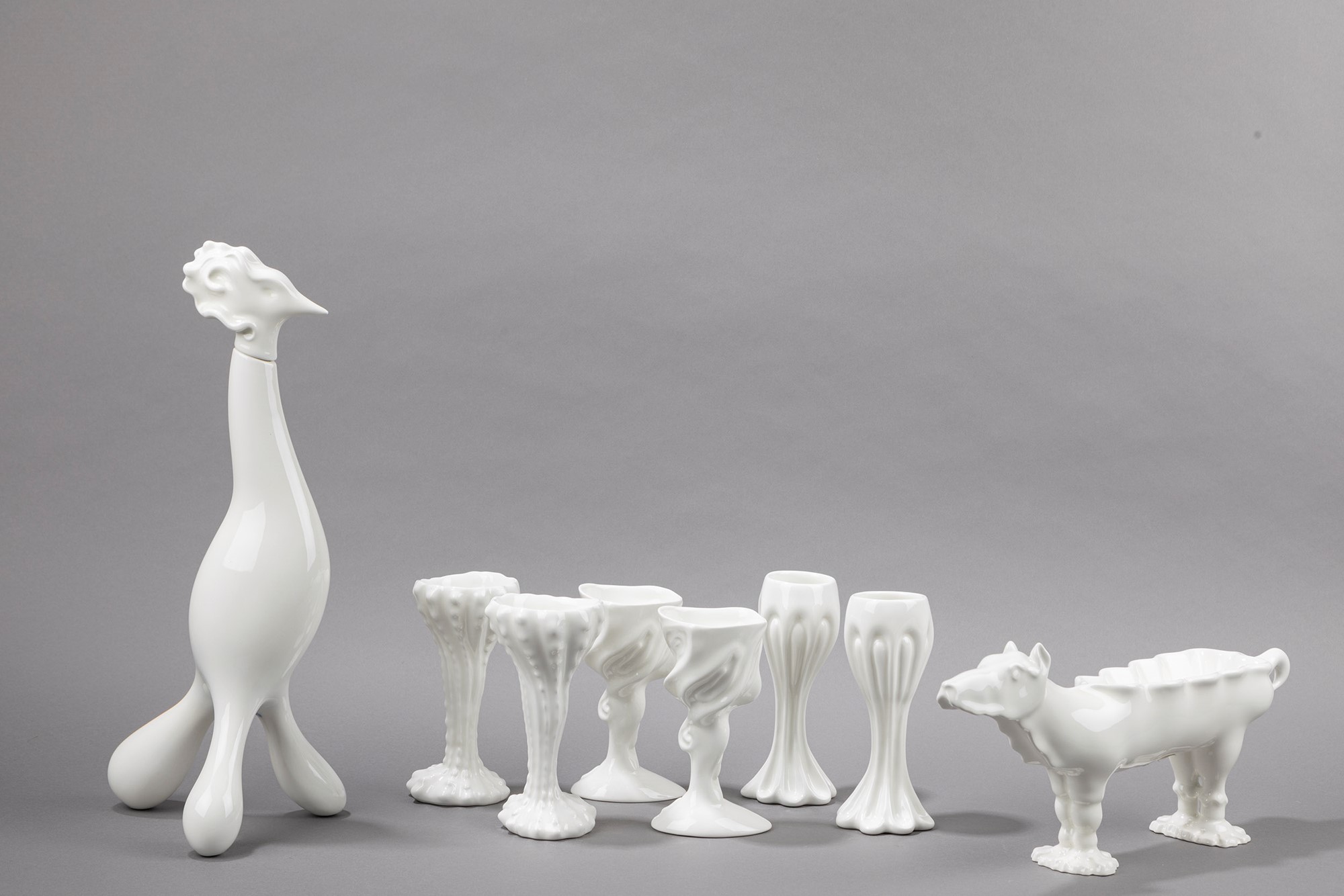 Gianpaolo Bertozzi & Stefano Casoni - Setmisure differenti Composto da Giovanna Bottiglia, Arturo Vaschetta e sei calici in ceramica Big-Bip. Produzione Cooperativa Ceramiche Imola.