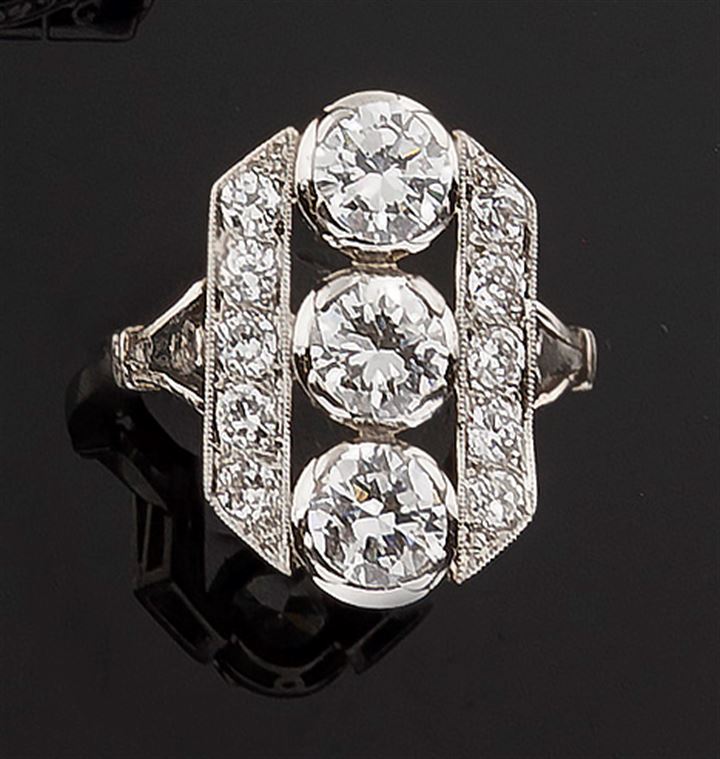 Anello in oro bianco, sommità di forma geometrica, con diamanti taglio brillante per complessivi ct 2,10 ca