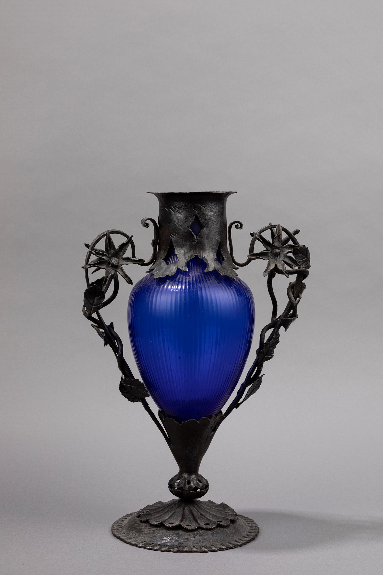 Umberto Bellotto - Vasoh 37 x 24 x 14 cm Connubio ferro e vetro soffiato di Murano; base a doppia ansa in ferro lavorato.