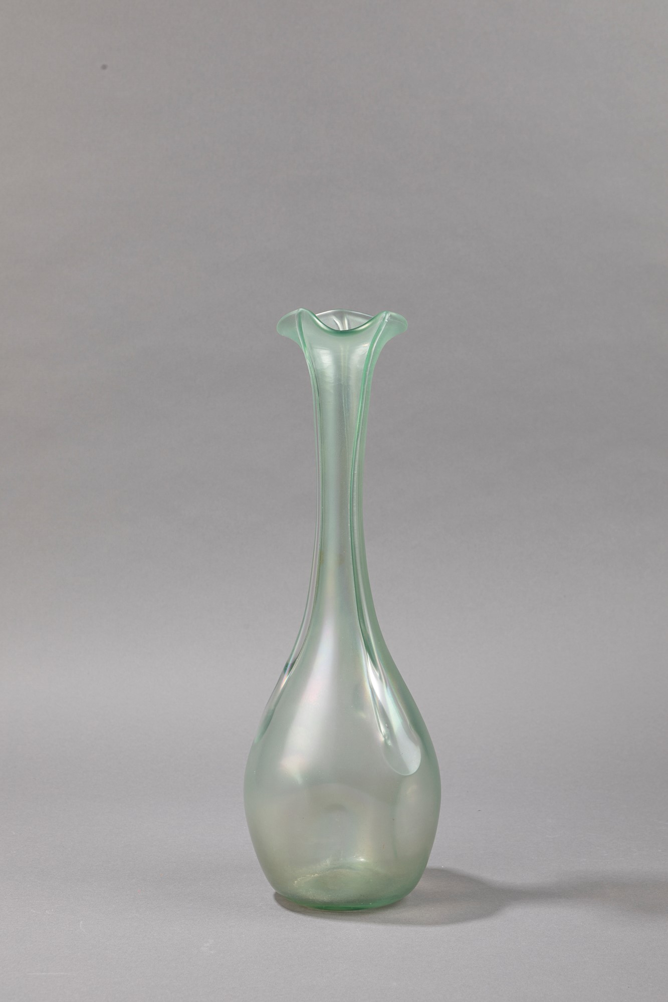 Vittorio Zecchin - Vasoh 35 cm x diam 14 cm in vetro soffiato verdino e forte iridescenza, in stile Secessione viennese. Produzione Artisti Barovier.