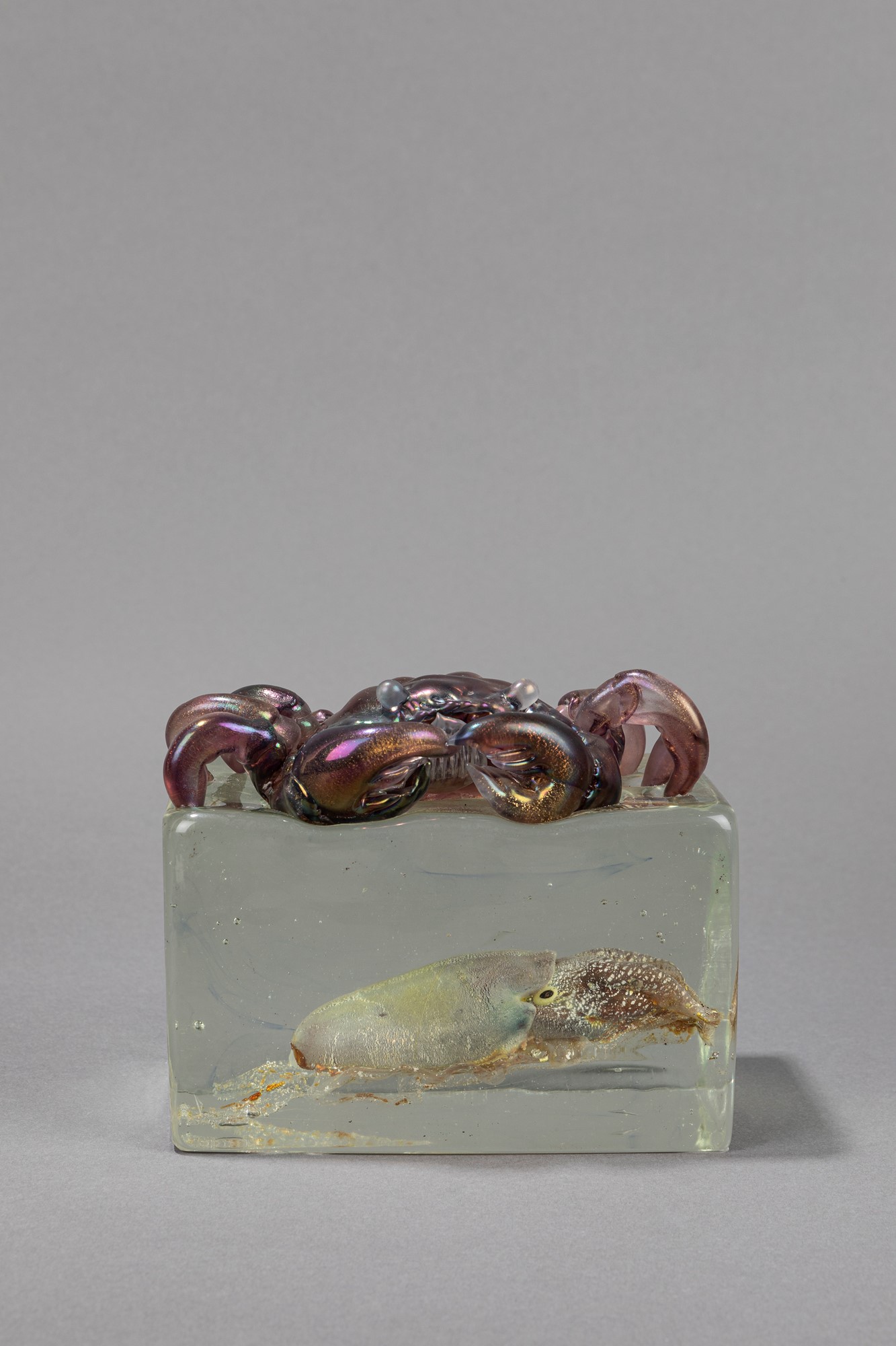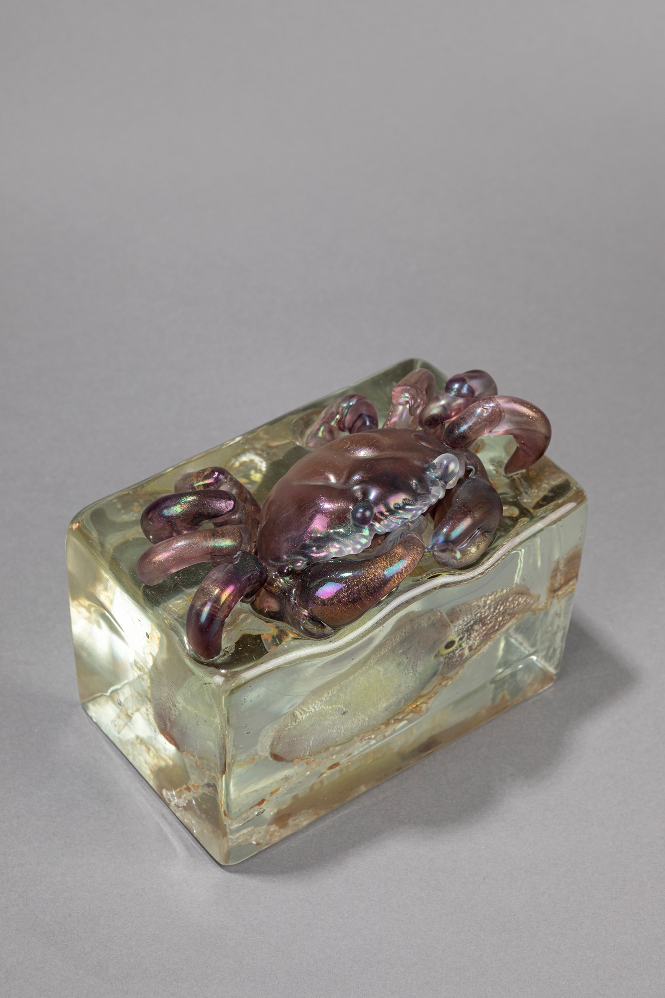 Alfredo Barbini - Gino Cenedese - Scultura in vetro sommerso – pezzo unicoh 14 x 16 x 10 cm Blocco in vetro cristallo trasparente con granchio ametista sfumato,