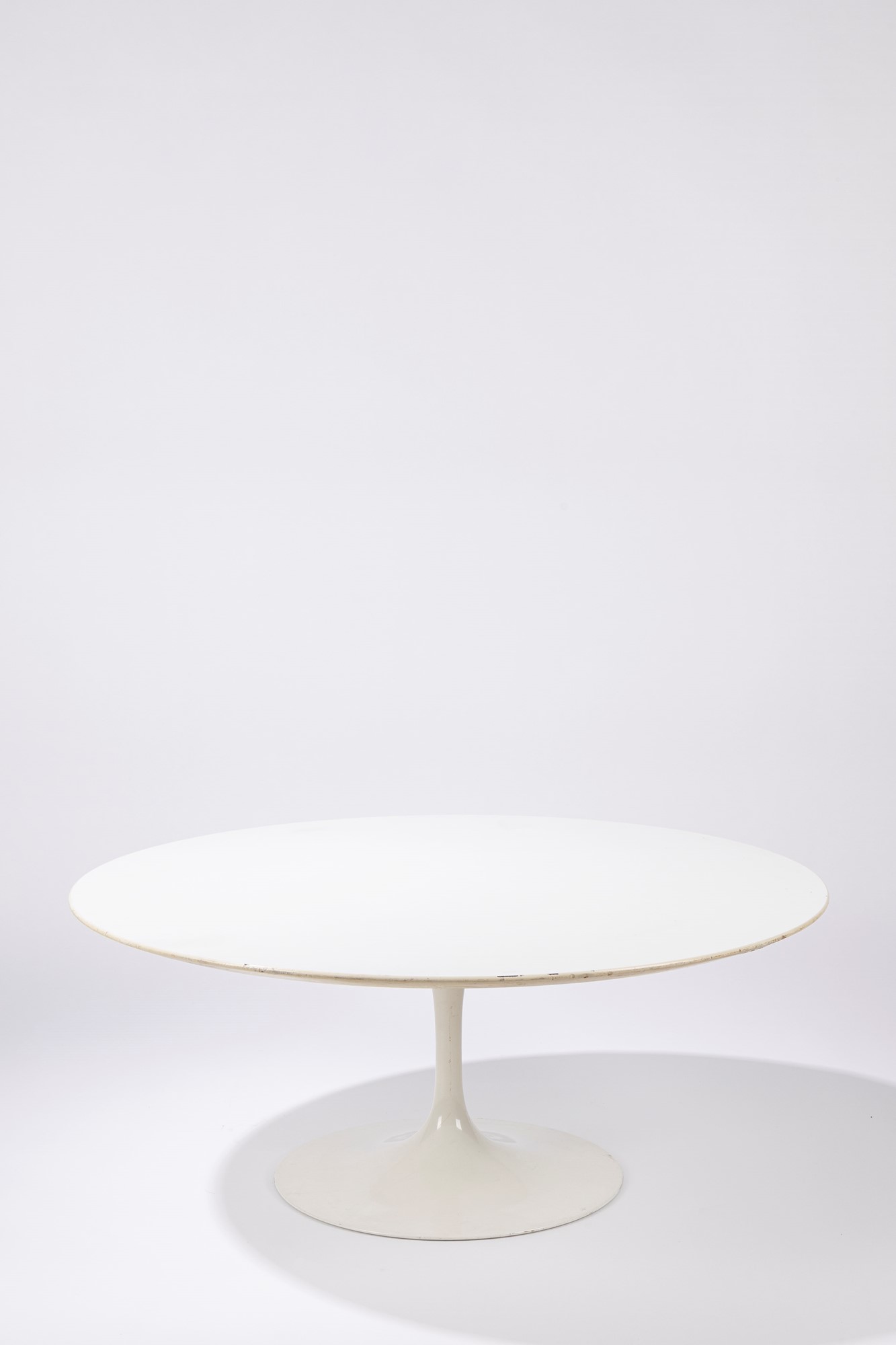 Eero Saarinen - Tuliph 37 x diam 91 cm Tavolino con piano ovale in laminato e base in alluminio. Produzione Knoll. Marchio originale.