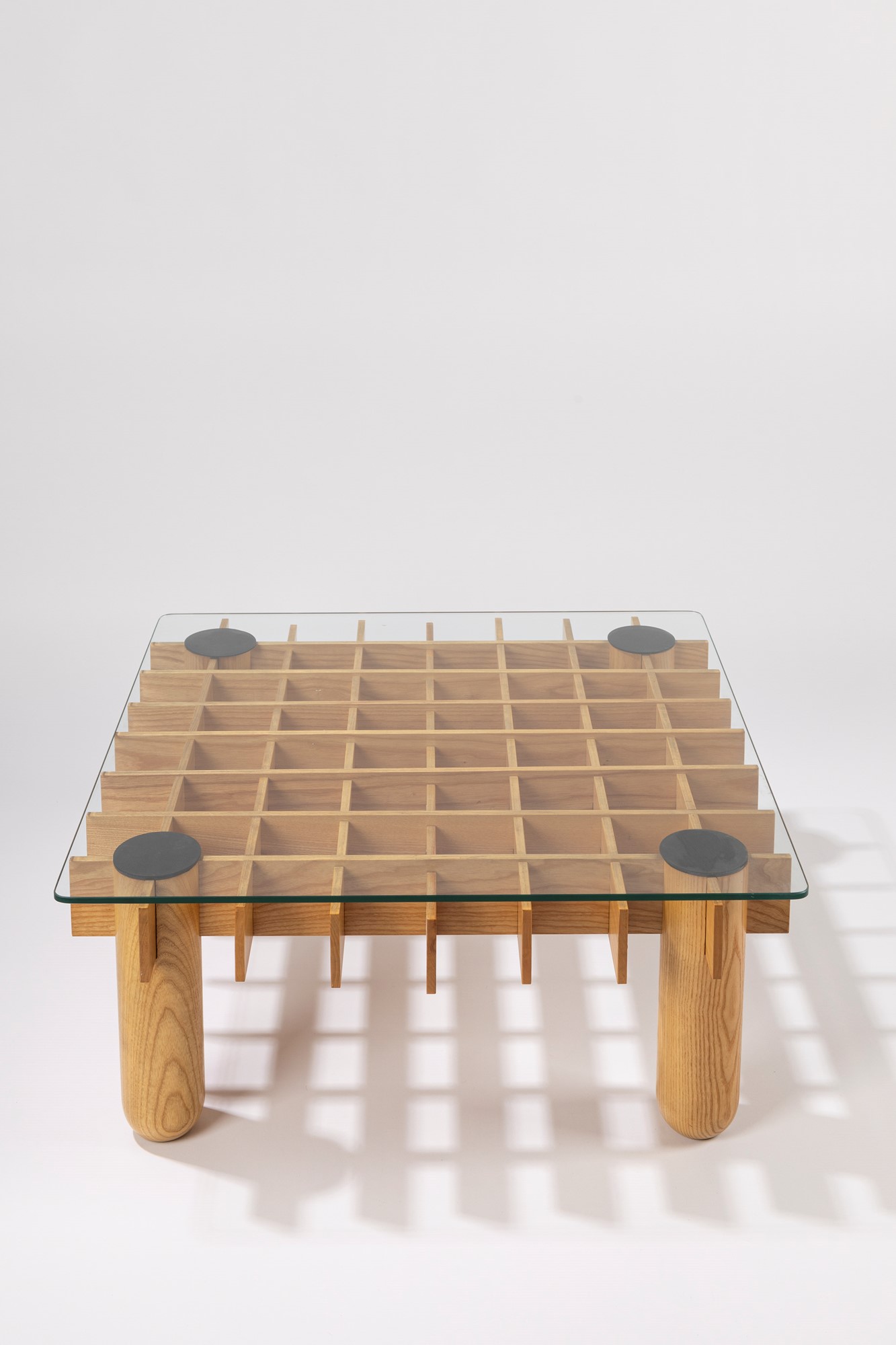 Gianfranco Frattini - Kyoto34 x 124 x 120 cm Tavolino in legno a incastro e piano in vetro. Produzione Ghianda, distribuito da Knoll International.