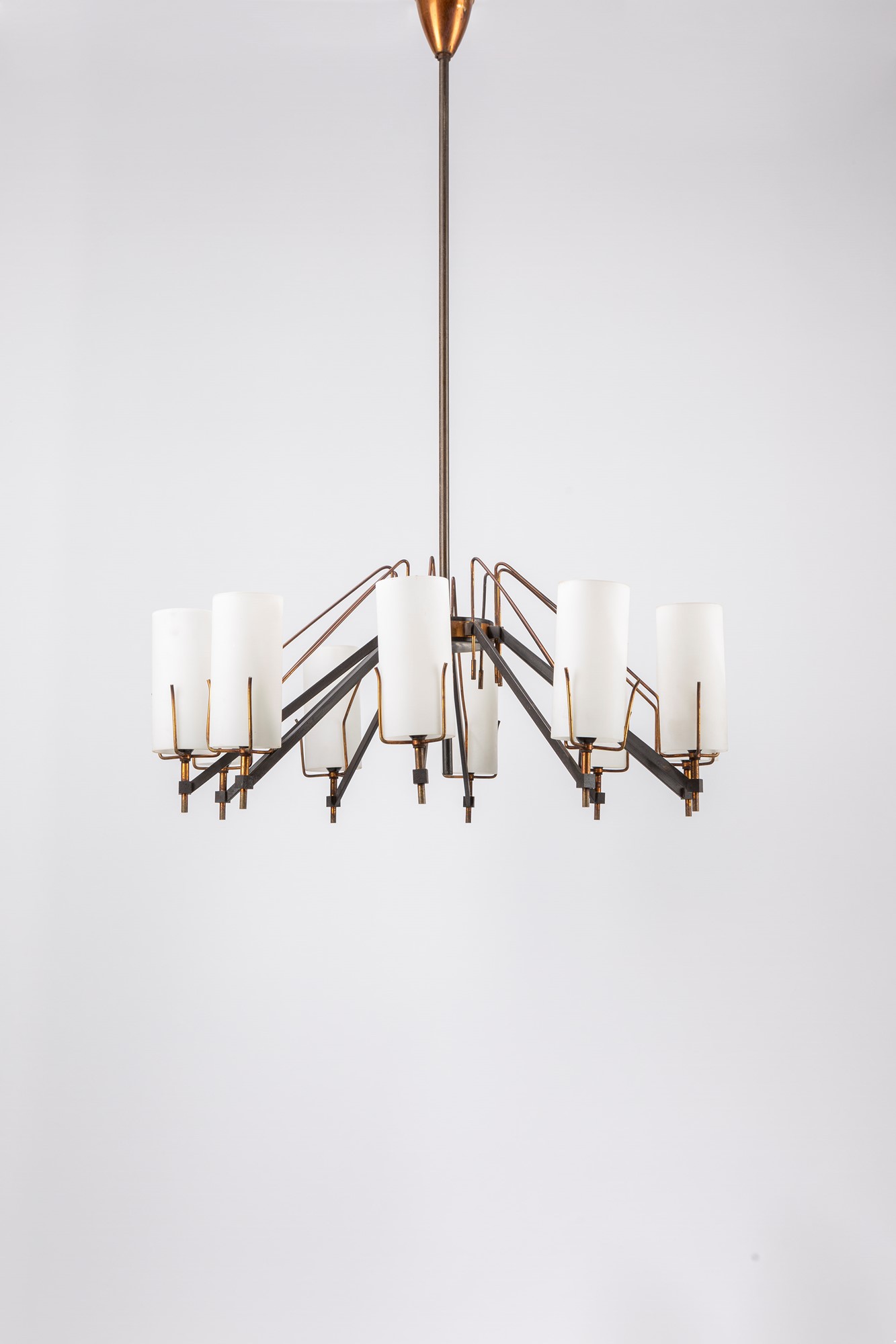 Stilnovo - Lampadarioh 100 x diam 78 cm a dieci luci con struttura in legno, ottone e metallo verniciato. Diffusori in vetro opalino satinato.