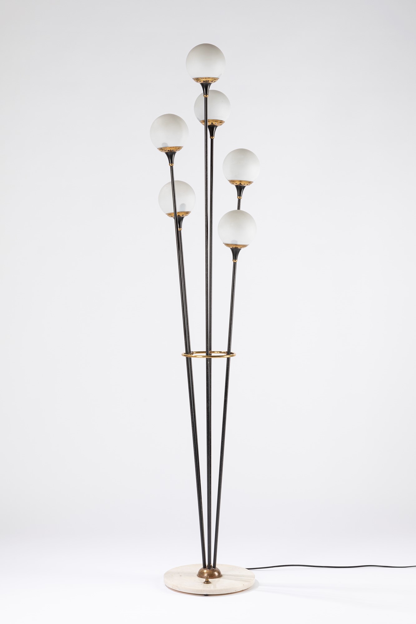 Stilnovo - Lampada da terrah 170 cm a sei luci con struttura in metallo, base in marmo e particolari in ottone. Diffusori in vetro opalino