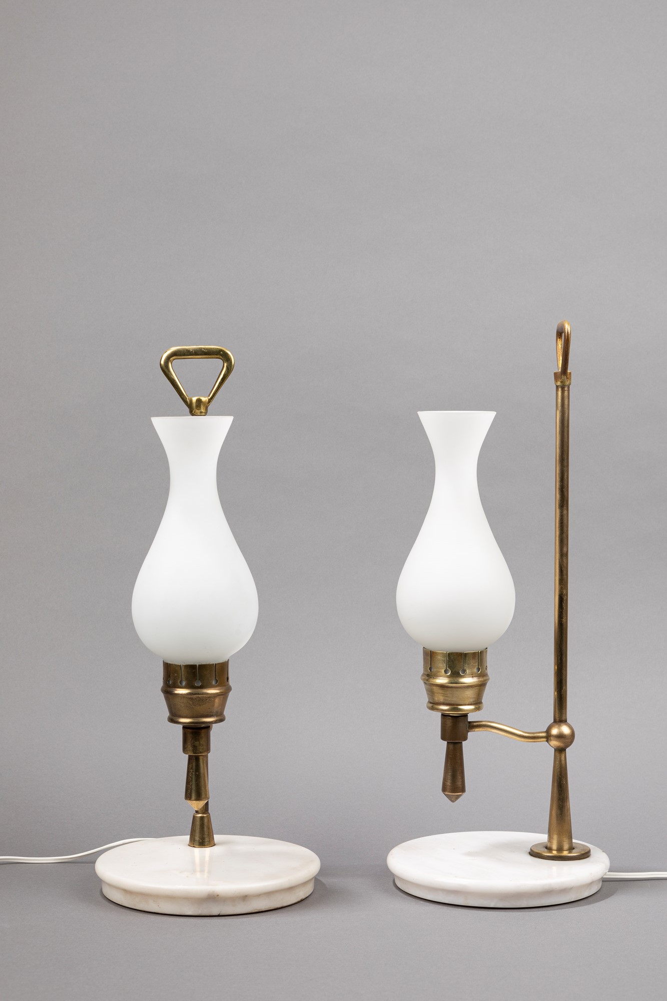 Stilnovo - Coppia di lampade da tavoloh 41 x diam 17 cm in ottone, diffusore in vetro opalino, base in marmo bianco.