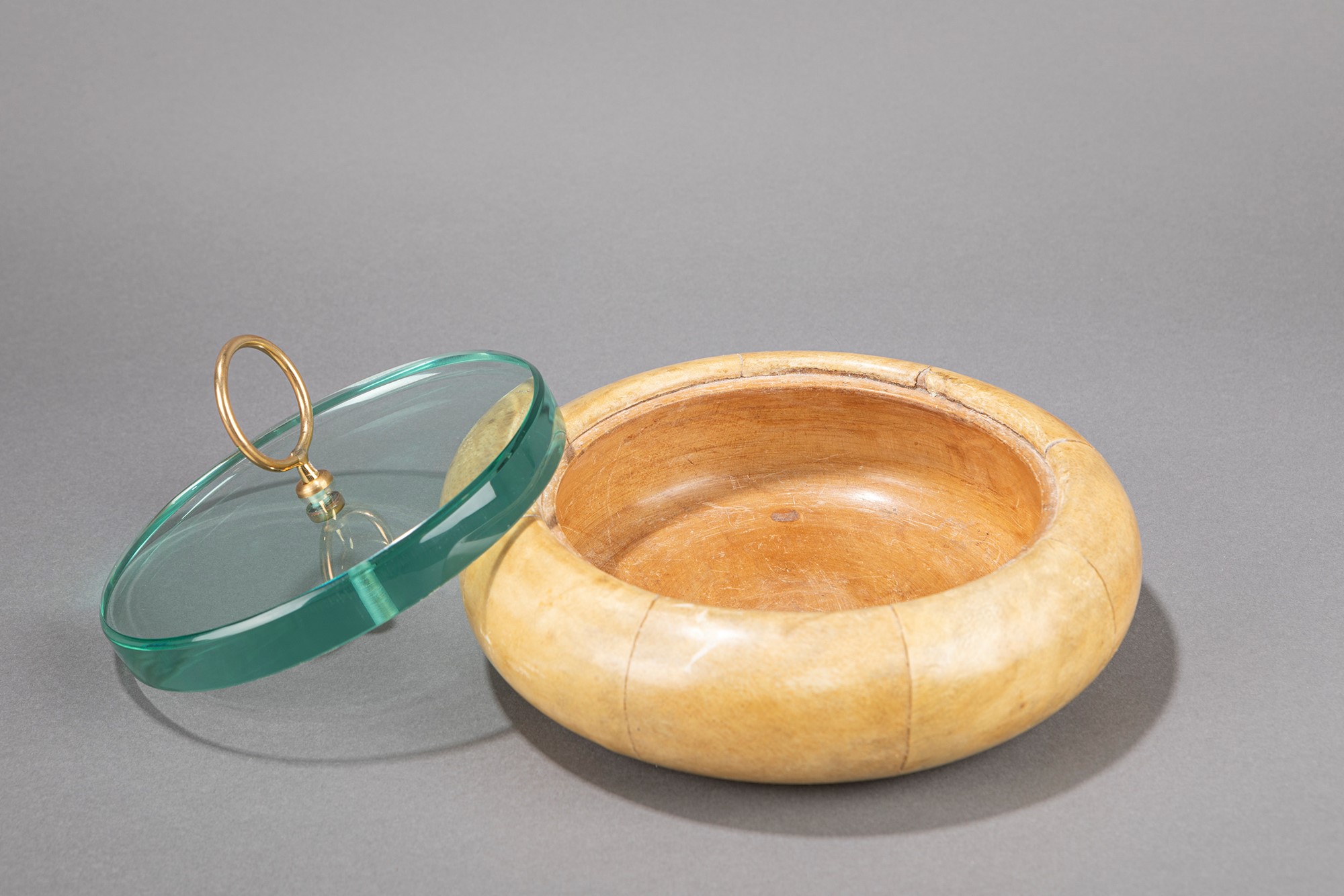 Fontana arte (Attribuito) - Scatolah 15 x diam 21 in pergamena con coperchio in vetro di grosso spessore e finiture in ottone.