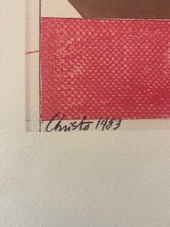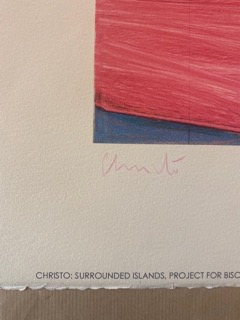 "Surrounded Islands, Project for Biscayne Bay, Greater Miami, Florida - 1983". Size: cm 56,5 x 76,5 - in 22,3 x 30,1. Year 2003. Chromolithograph on museum cardboard. Edition of 350. Hand signed by Christo lower left, not numbered. Published and distribuited in 2003 by MACBA, Museo de Arte Contemporaneo de Barcellona. On the back COA with stamp, title and signature of Grafiche d'Arte Lombardi. Provenance: Private Collection Italy