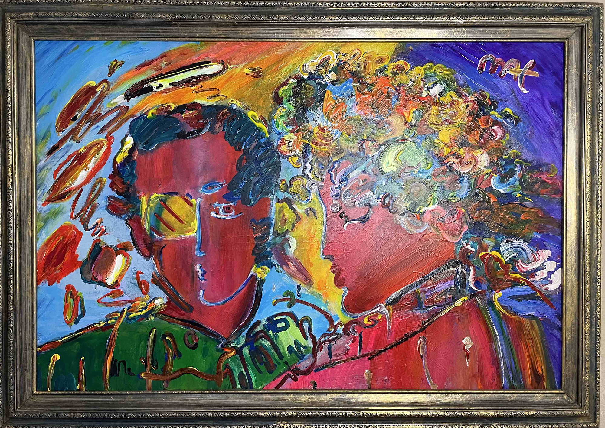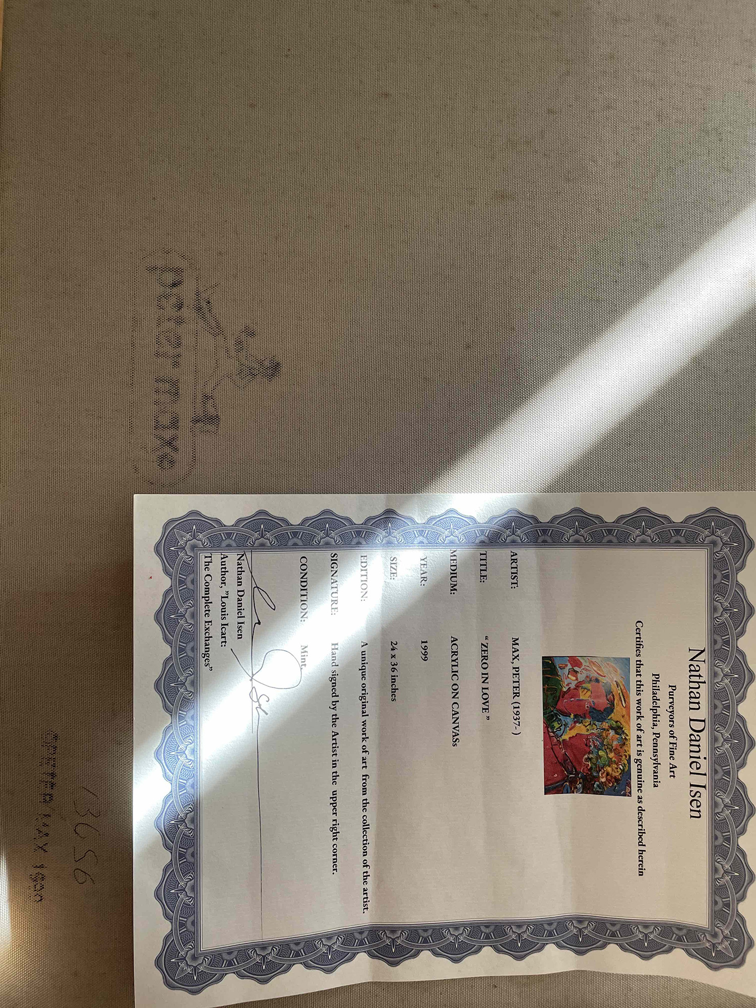 "Zero in love". Acrylic on canvas. Year 1999. Size 24x36 inc. A unique original artwork from the collection of the artist. Hand signed by the artist in the upper right corner. Artist's stamp and inventory number 13056 on the back. The artwork is accompanied by the certificate of authenticity released by Nathan Daniel Isen, Philadelphia. Provenance: Private Collection, Hawaii