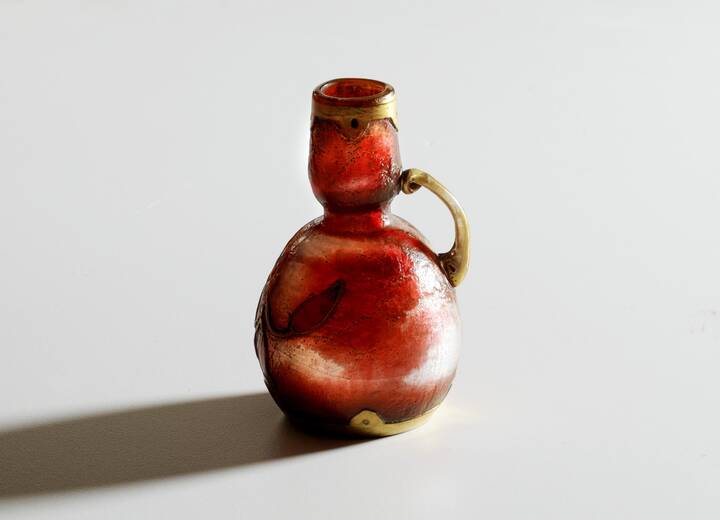 Vasetto miniature con ansa in vetro doppio, decoro floreale lumeggiato ad oro finemente inciso ad acido su fondo rosso.