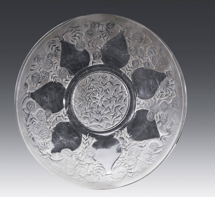 Piatto in vetro bianco con incisioni stilizzate soffiato in forma.