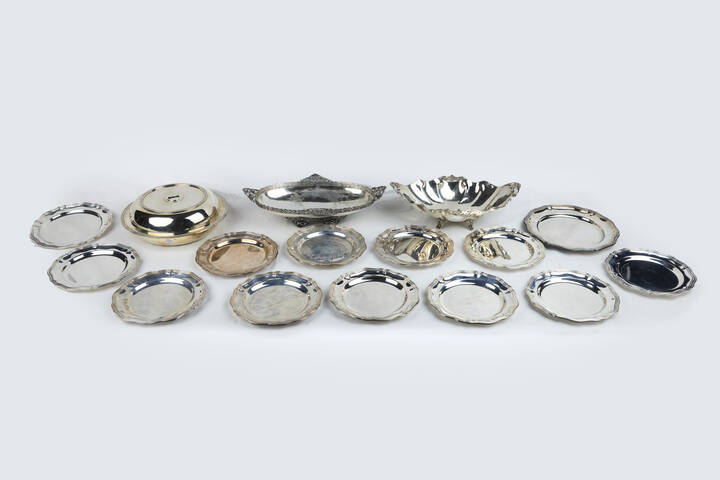 - 13 piattini con bordo mosso di varie forme e misure. Peso gr 2511,5