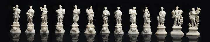 Tredici statuine in alabastro di cui due raffiguranti i quattro elementi; due muse e nove allegorie dei segni zodiacali