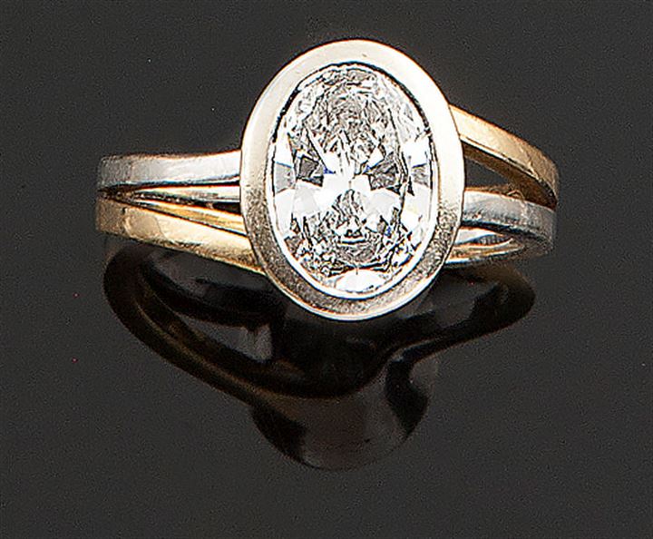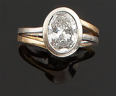 Anello in oro giallo e bianco, firmato "Olivero", al centro diamante solitario taglio ovale di ct 1,84 ca