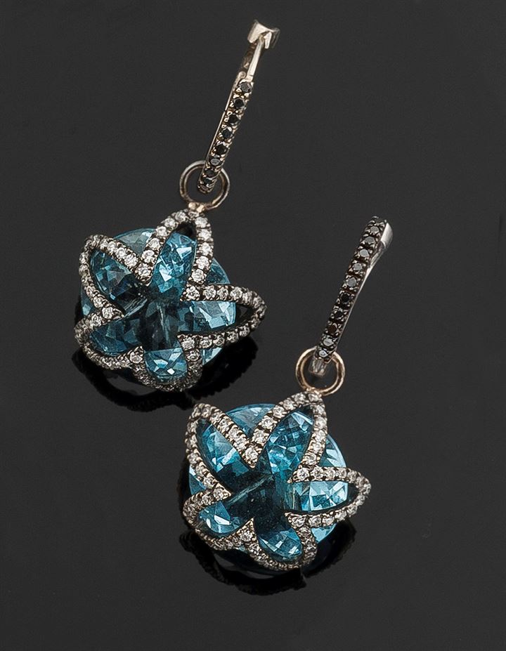 Coppia di orecchini in oro bianco e brunito, firmati "Fragile", a monachella, con due acquamarine taglio rotondo inserite all'interno di una struttura in diamanti taglio brillante