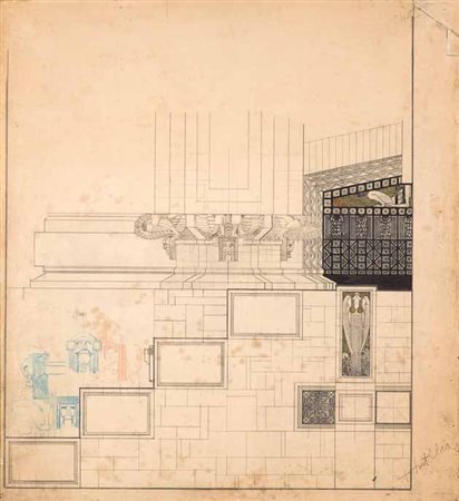 Antonio Sant’Elia Como 1888 – Monfalcone 1916 Architettura, 1911/1912 tecnica mista su carta applicata su tela, cm 102x94. Firmato in basso a destra: A. Sant’Elia. L’opera è riferibile con certezza ad Antonio Sant’Elia, come prova anche la firma autografa, ed è databile alla sua attività iniziale, tra il 1911 e il 1912, prima delle semplificazioni strutturali del 1913. Coevo ed affine per le caratteristiche stilistiche e del segno alle tavole del nuovo cimitero di Monza progettato nel 1911-12 con il collega e amico architetto Italo Paternoster (cfr. L.Caramel , A.Longatti, Antonio Sant’Elia. L’opera completa, Arnoldo Mondadori editore, Milano 1987, pp.150-151) e a quelle per la seconda edizione del concorso per la nuova stazione ferroviaria di Milano, realizzate nel 1912 da Sant’Elia con la collaborazione per le decorazioni plastiche dello scultore Giovanni Possamai (cfr. L.Caramel, A.Longatti, Antonio Sant’Elia. L’opera completa, Arnoldo Mondadori editore, Milano 1987, pp.156-158), potrebbe riferirsi ad uno dei due lavori. Luciano Caramel