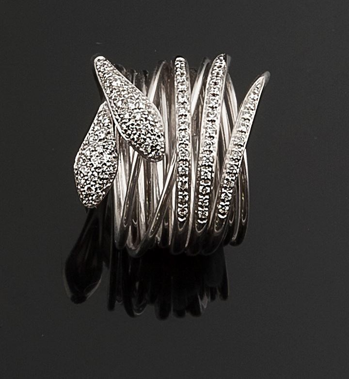 Anello in oro bianco, composto da due serpenti stilizzati intrecciati; teste e code in diamanti taglio brillante per complessivi ct 0,40 ca