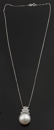 Catena con ciondolo in oro bianco con perla australiana del diam di mm 16,1 sormontata da file di diamanti taglio brillante per complessivi ct 0,30 ca