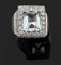 Anello in oro bianco, sommità di forma rettangolare, con al centro acquamarina taglio rettangolare contornata da diamanti taglio brillante per complessivi ct 3,50 ca