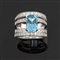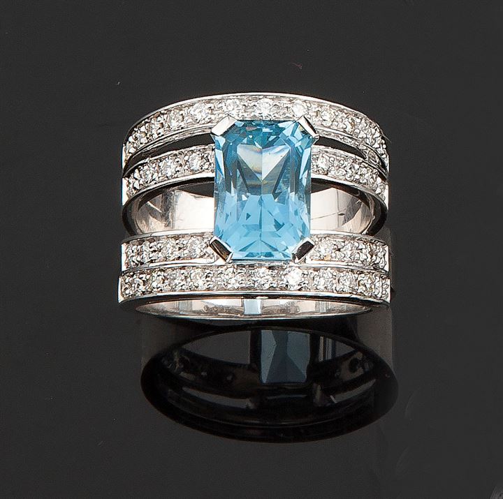 Anello in oro bianco, a fascia, con acquamarina taglio rettangolare di ct 3,21ca e diamanti taglio brillante per complessivi ct 0,50