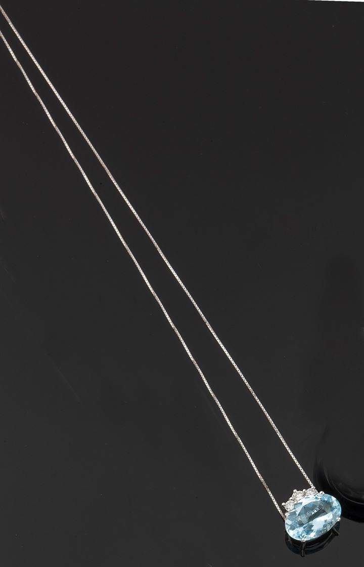 Catena con ciondolo in oro bianco, recante acquamarina di taglio ovale sormontata