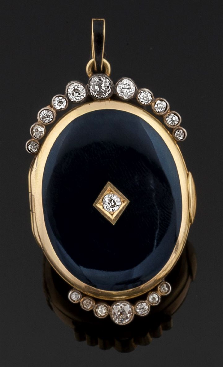 Ciondolo portafoto in oro giallo, fine XIX secolo, in onice e diamanti taglio brillante di vecchio taglio per complessivi ct 1,60 ca