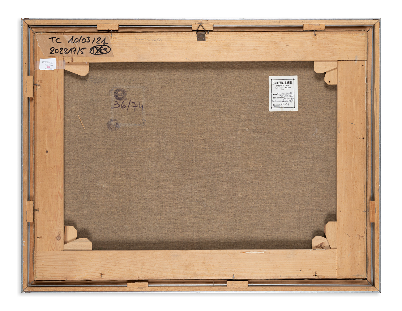 Etichetta della Galleria Carini (MI) e ulteriori timbri indecifrati al retro