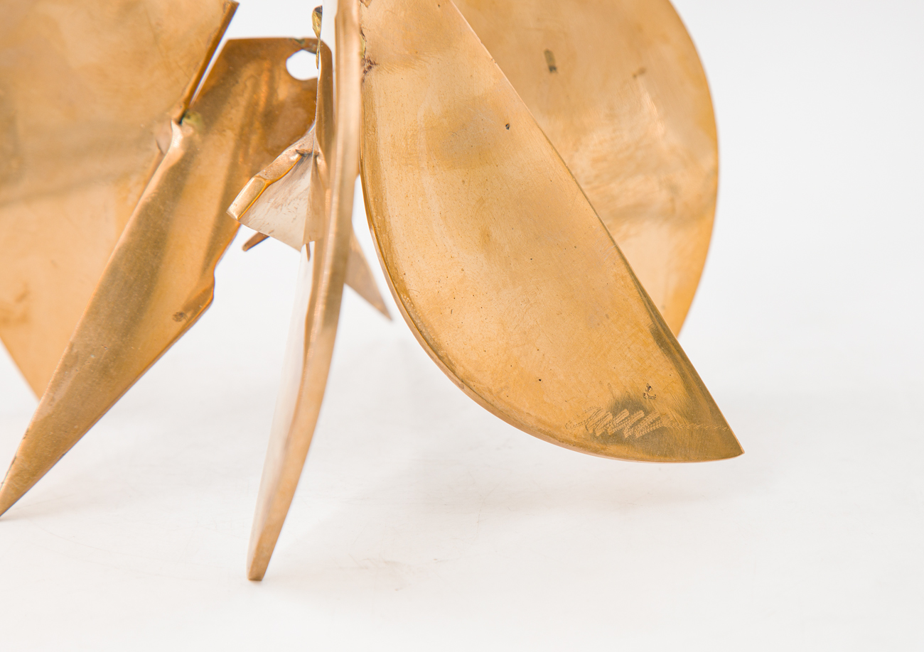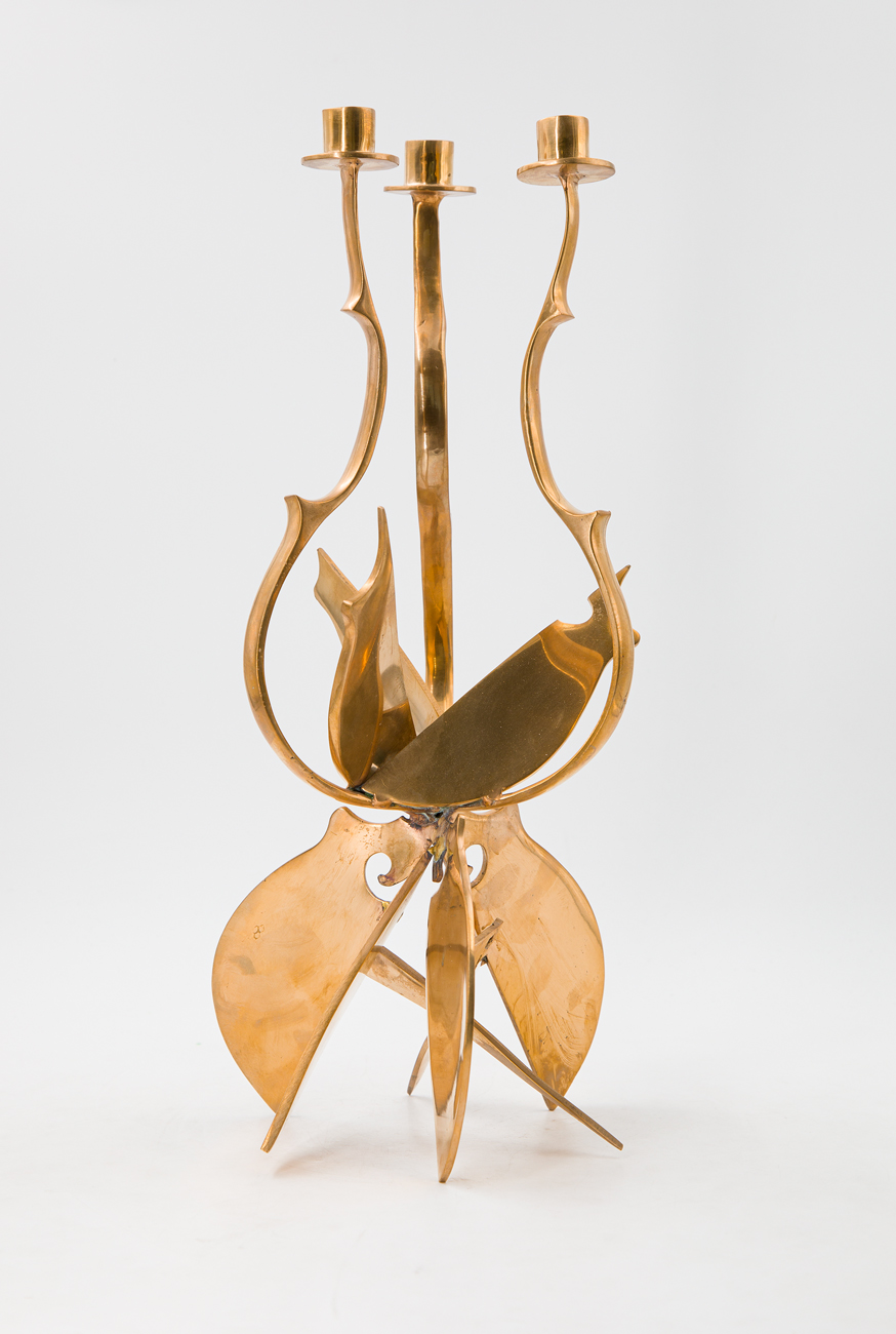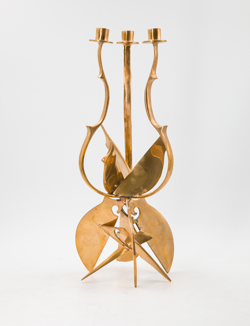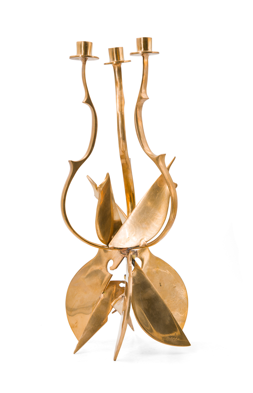 Scultura a candelabro con parti di violino in bronzo a patina dorata