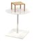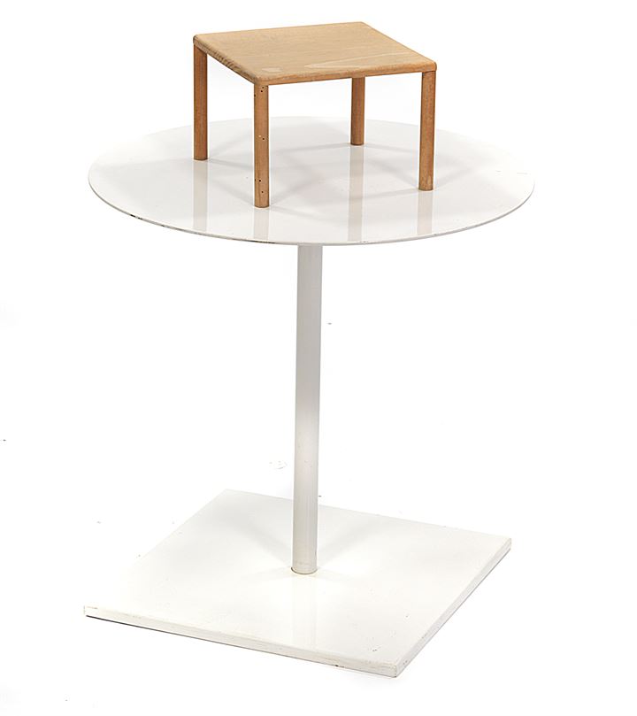 Tavolino in metallo laccato bianco con sovrapposto modellino di tavolo in legno.
