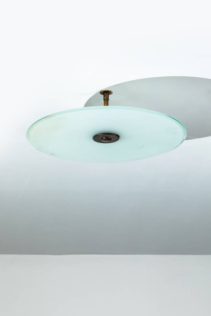 Lampada a plafone in vetro colorato satinato e metallo brunito.