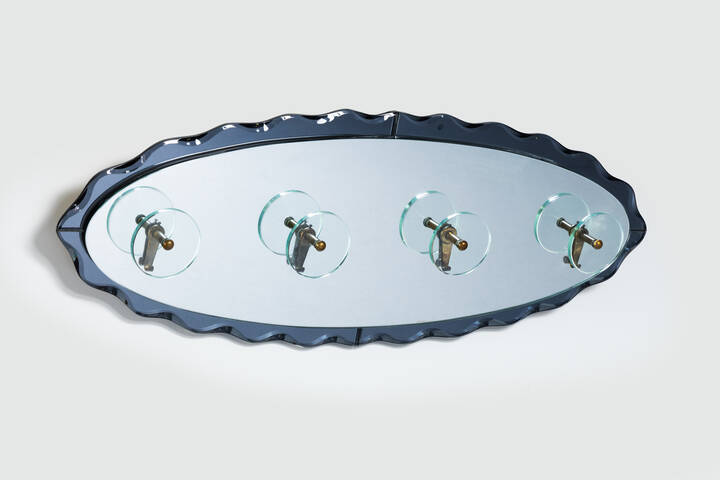 Appendiabiti in vetro colorato e vetro specchiato, particolari in ottone.