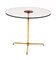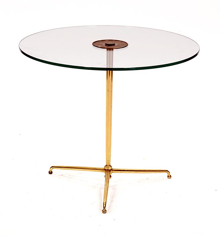Tavolino con base a tripode in ottone, piano in cristallo.
