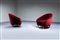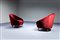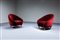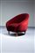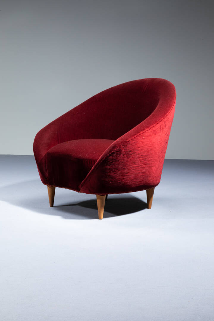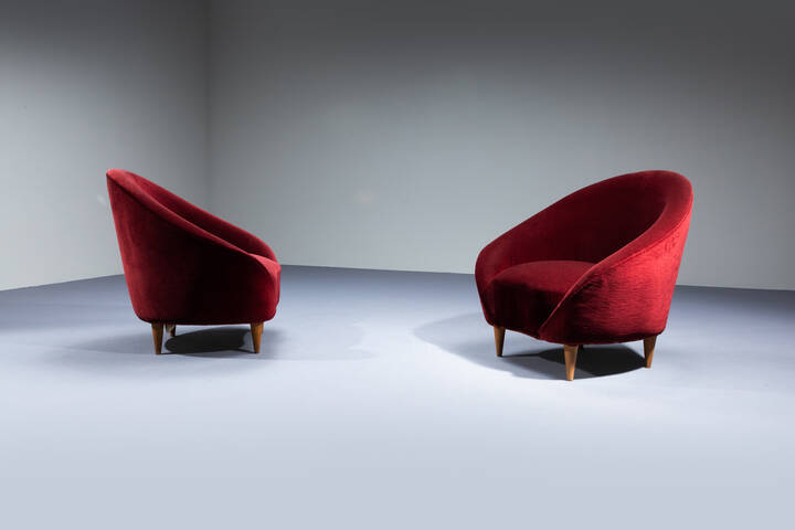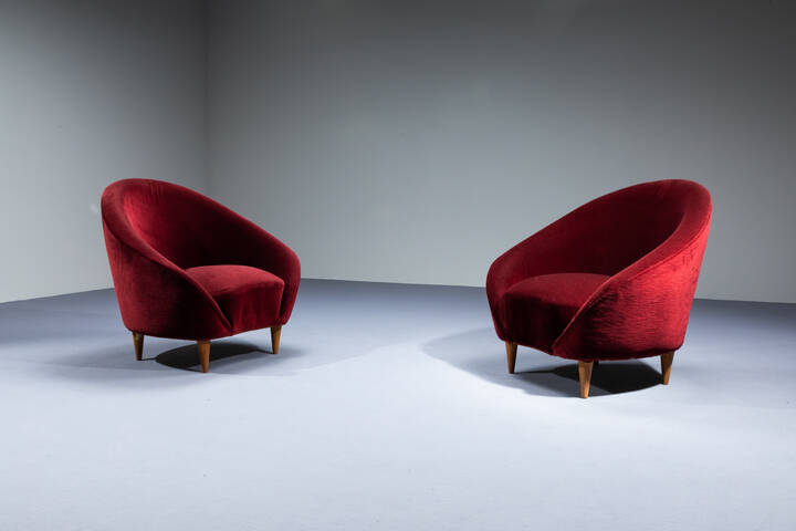 Coppia di poltrone curvo con imbottitura rivestita in velluto, gambe coniche in legno.