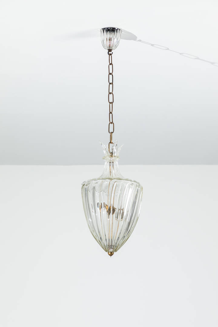 Precedente Lotto 36 Successivo Sant’Agostino - Corso Tassoni 56, 10144 Torino 208 Design Sessione unica mercoledì 13 luglio 2022 ore 16:00 (UTC +01:00) SEGUSO SEGUSOLanterna in vetro trasparente costolato.Anni '50diffusore h cm 48