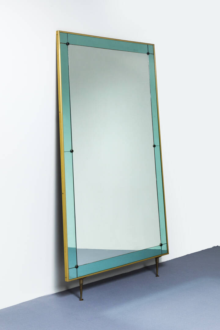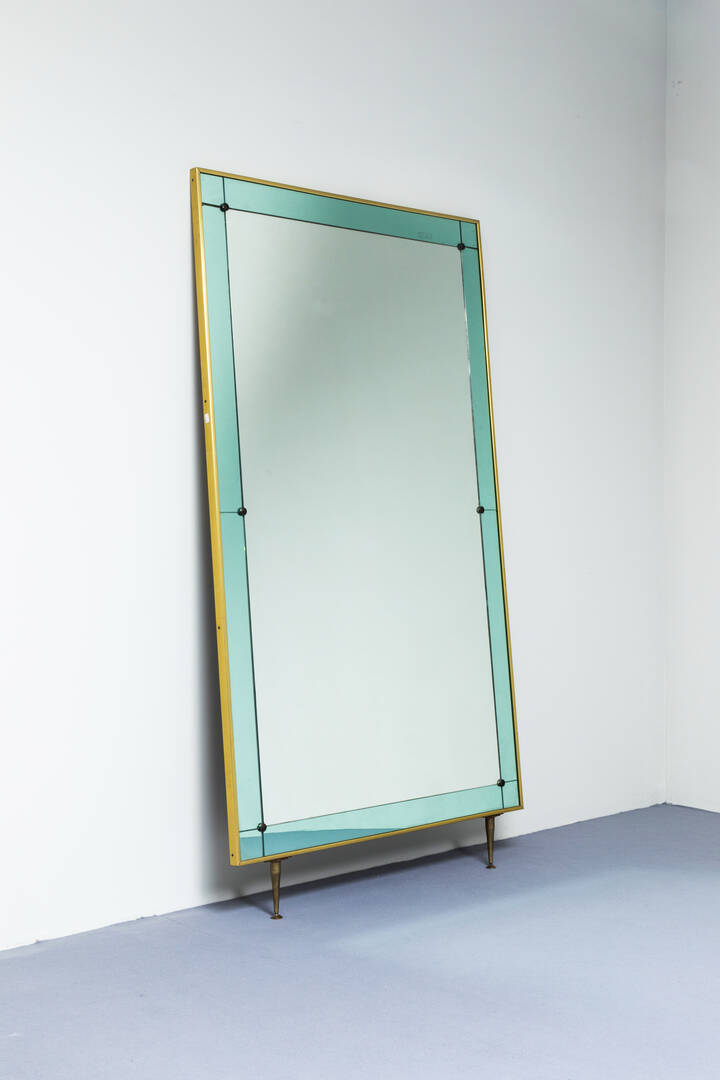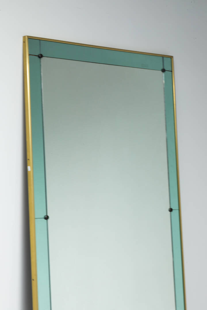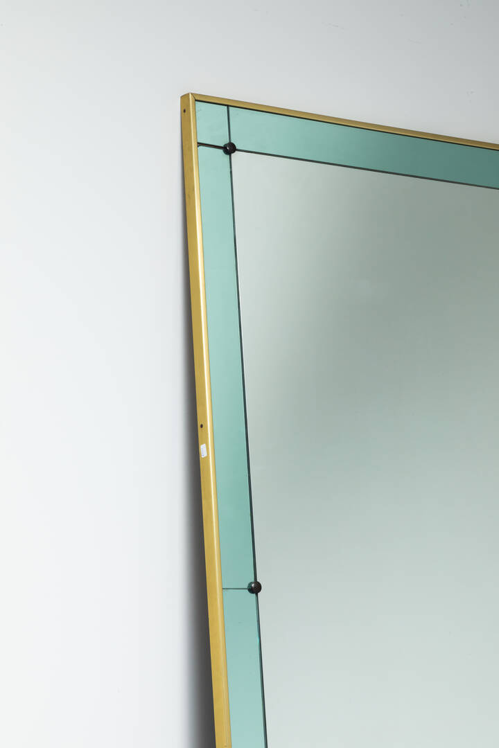 Specchiera con cornice in vetro colorato, bordo e sostegni in ottone.